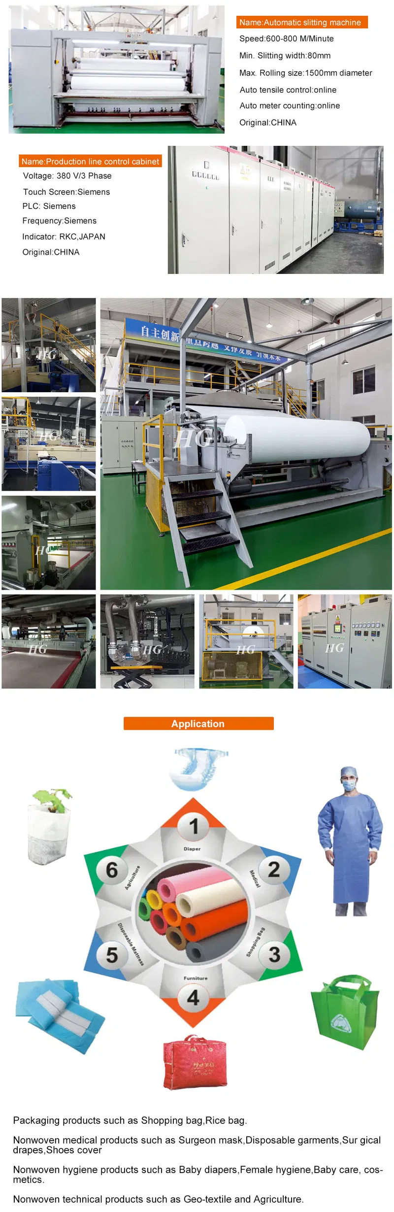 | HG-1600SS | 1600 mm | 9000Kg. | 350M/min. | Spunbond | 8-150 | 35*10*11metros |